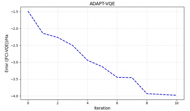 以上收敛曲线展示了优化过程:随着关键算符被逐步选入拟设,能量误差在对数坐标下呈近似线性下降,并最终达到预设精度。