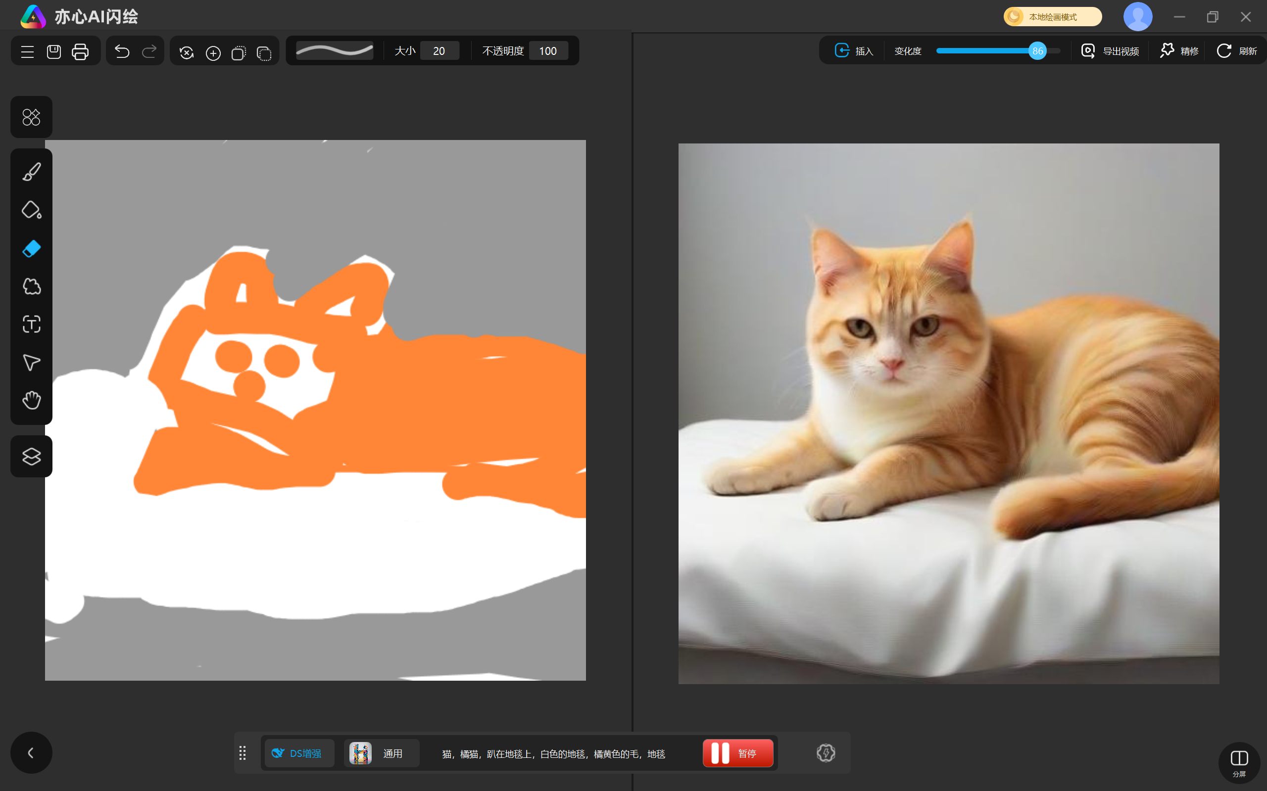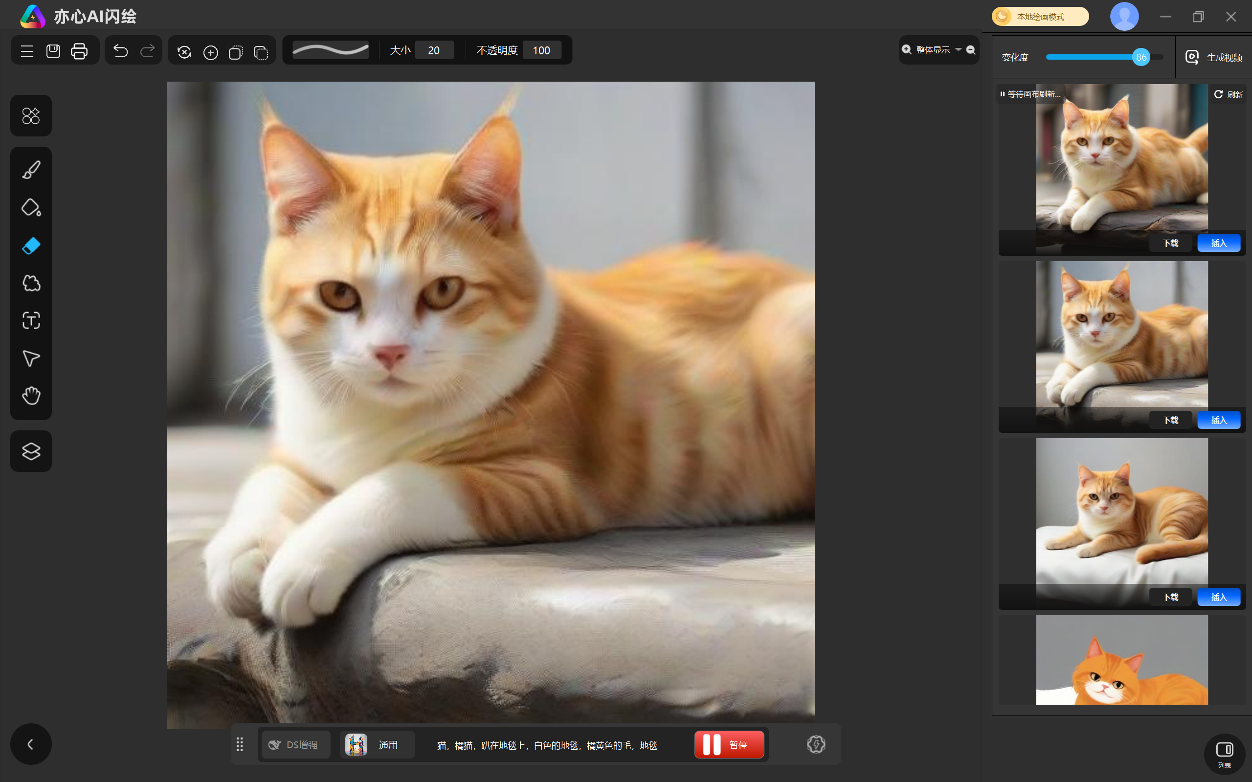 对生成结果不满意?简单修改提示词或调整草图,AI如同一位理解力超群的助手,实时响应,几秒之后就带来几个版本的迭代更新,每一次微调都能带来多次修改。仅仅数次迭代,一张毛发都清晰的橘猫就已经跃然屏幕之上。