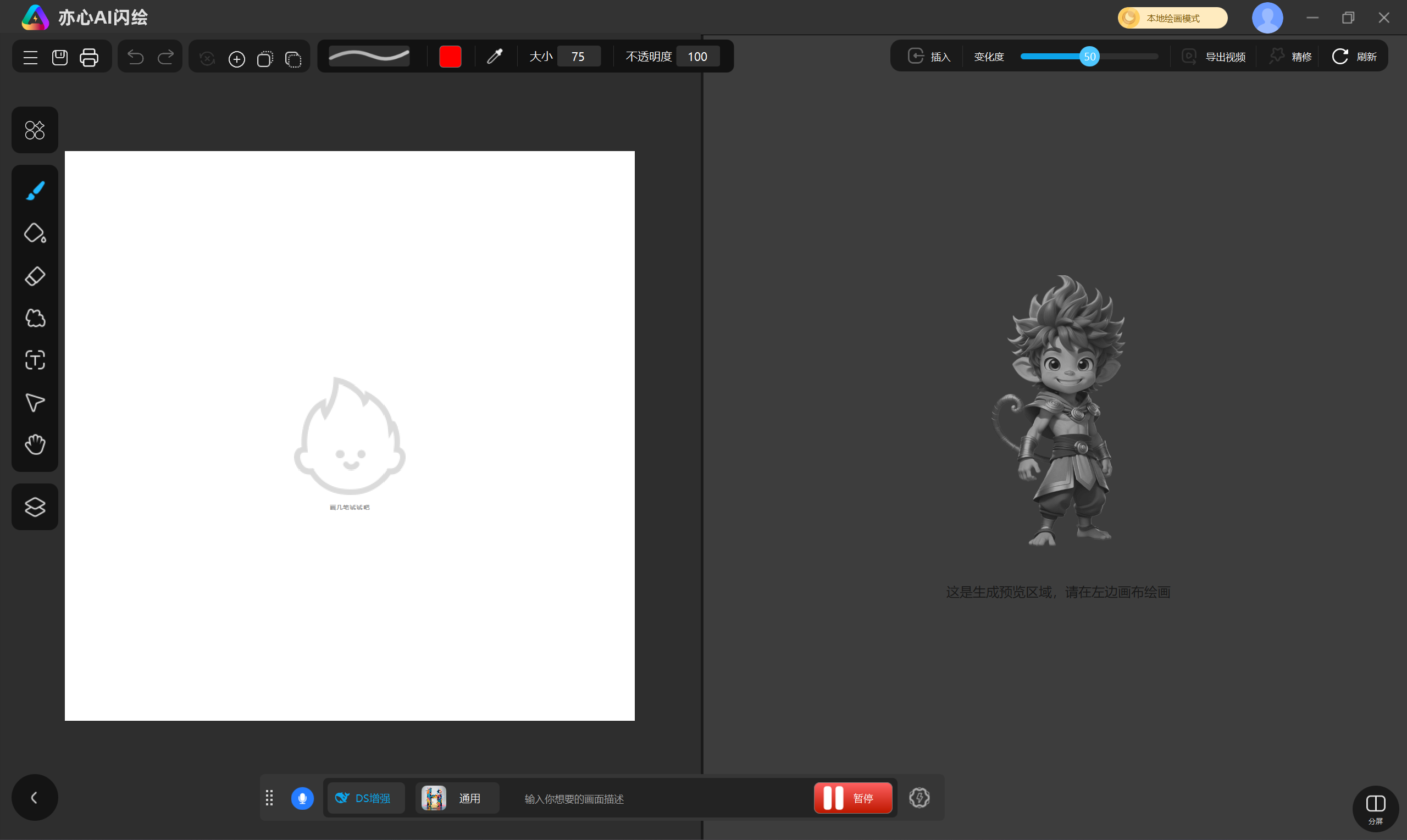 启动闪绘AIPC版,本地模型加载完成。创作界面干净直观,左侧是画布与工具栏,右侧是AI生成面板。