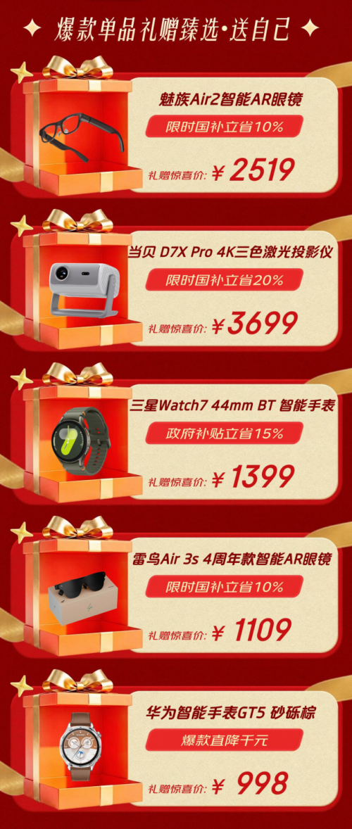 当然,最重要的别忘了犒劳自己。魅族Air2智能AR眼镜限时补贴省10%,2519元踏入未来视界;当贝D7X Pro 4K三色激光投影仪补贴立省20%,3699元打造私人影院;三星Watch 7智能手表政府补贴省15%,融合时尚与科技,礼赠惊喜价1399元;雷鸟Air 3S四周年款AR眼镜补贴省10%,1109元享受随身巨幕;华为智能手表GT5砂砾棕爆款直降千元,仅需998元,彰显运动风尚。