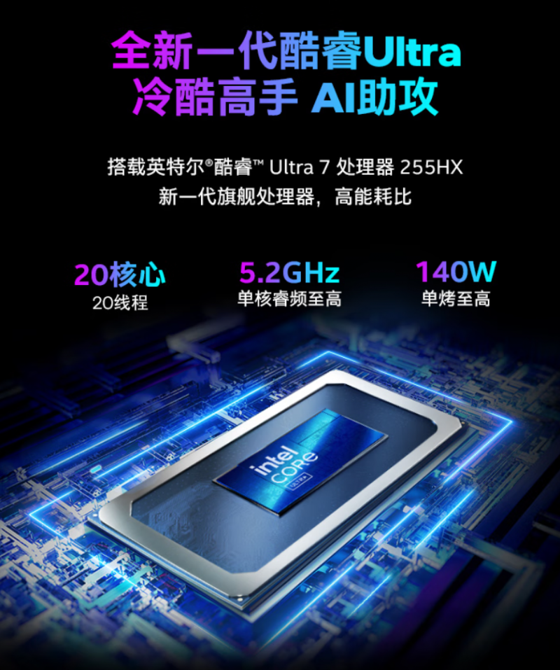 两款机型的差距集中在处理器,而机械革命耀世16 Ultra搭载的英特尔酷睿Ultra 7 255HX,作为Arrow Lake新平台产品,在硬件规格上实现了对AMD锐龙9 8940HX(Dragon Range平台)的全面领先,为极致性能奠定了坚实基础。