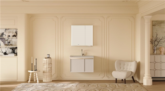 在美妆洗漱场景,传统美妆灯光与室外光差距大,九牧推出A2521系列轻智能浴室柜,专门加装手扫圆弧加宽双侧灯,采用模拟自然日光的6000K色温灯光,显色指数高于90,挥手感应即亮,真实还原妆容色彩。