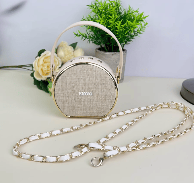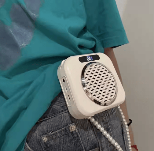佩戴:无线麦克风仅重 11克 ,支持磁吸和领夹。主机外观设计采用了 小香风包包造型+珍珠挂链 ,对于注重形象的女导游来说,它不仅是工具,更是时尚配饰。