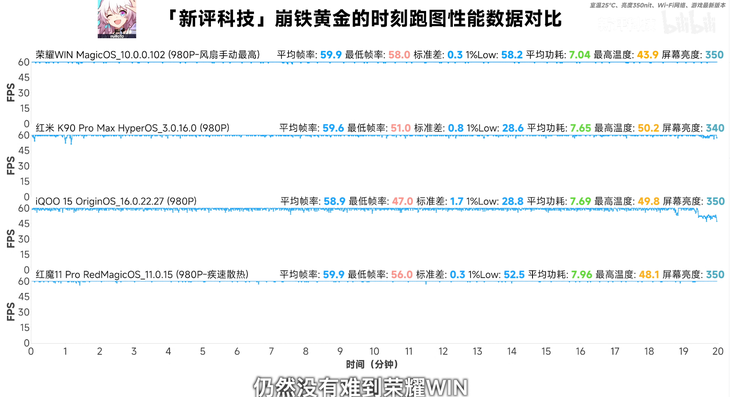 新评科技的测试则进一步验证了其优势:在被称为“性能杀手”的《崩坏:星穹铁道》高负载场景中,荣耀WIN不仅帧率标准差仅0.3,1% Low帧高达58.2,领先红魔11 Pro等竞品,机身最高温也未超过44℃,较红米、iQOO低6℃,较红魔低4.2℃,充分证明“性能压力越大,主动散热的收益越显著”。