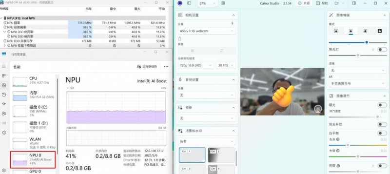 - 实际负载测试:运行CamoStudio(专业AI摄像头软件)执行背景虚化、手势识别任务时,酷睿版可调用NPU独立算力,此时NPU占用率达41%,RTX 5060笔记本GPU的功率仅在6.805W-16.716W区间,核心温度稳定在55℃左右;而锐龙版无独立NPU支撑,需依赖GPU完全负载,GPU功率更高,温度比酷睿版高10℃左右。酷睿版的这一设计,有效降低了高功耗硬件的负担。