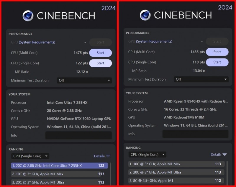 - CINEBENCH 2024测试:酷睿版多核得分1475pts,反超锐龙版的1435pts(领先3%)。