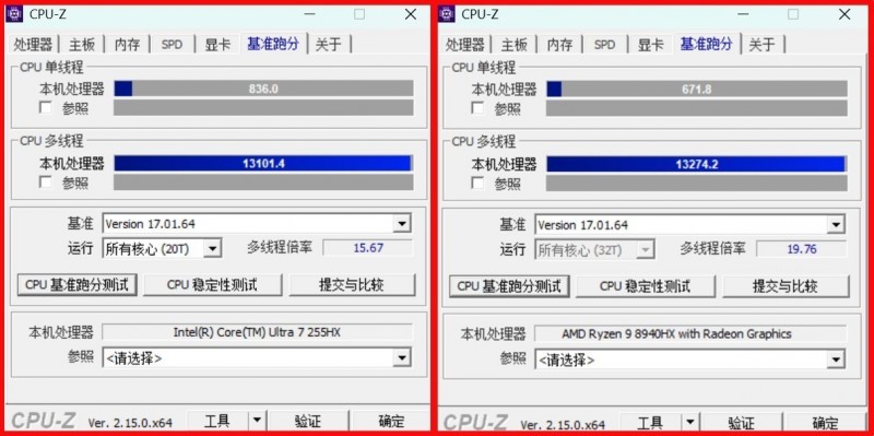 多核性能方面,两款处理器在新旧版本软件下呈现出鲜明的差异化特征:CPU-Z测试:酷睿版多核得分13101.4pts,略落后锐龙版的13274.2pts(差距1%);