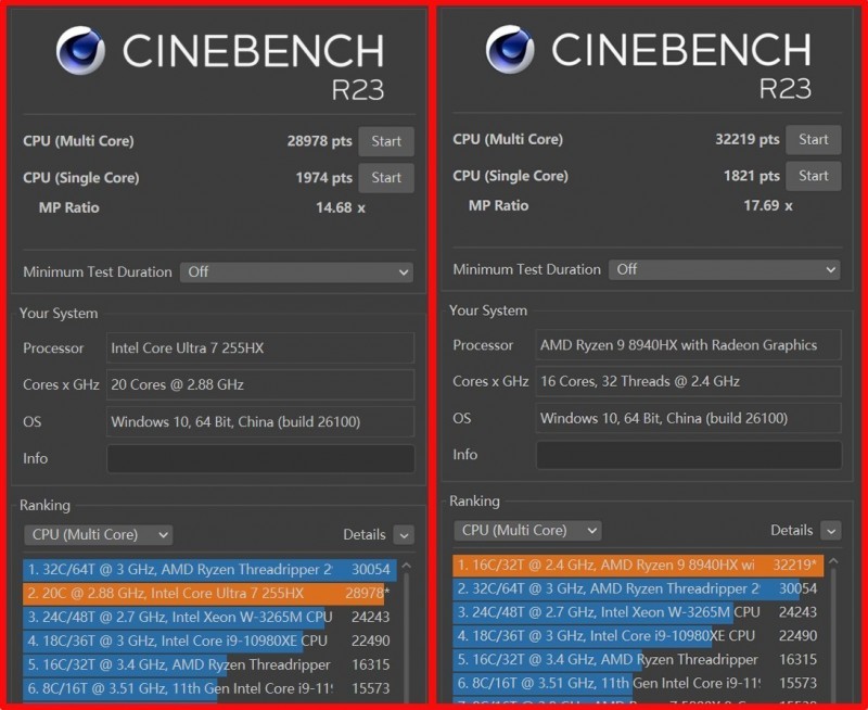 - CINEBENCH R23测试:酷睿版多核得分28978pts,落后锐龙版的32219pts(差距10%);