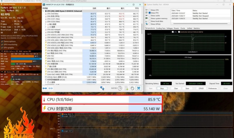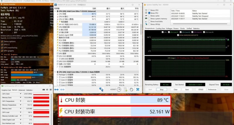 - CPU+GPU双烤:30分钟双烤后,酷睿版CPU温度89℃、功耗52W,RTX 5060 GPU功耗稳定,风噪控制在较低水平,长时间游戏或创作时,机身表面温度与噪音均不会影响使用体验。