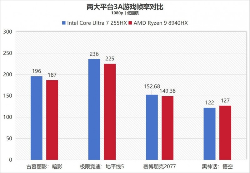 - 3A游戏:《古墓丽影:暗影》帧率196fps(领先锐龙版5%)、《极限竞速:地平线5》236fps(领先5%)、《赛博朋克2077》152.68fps(领先2%),仅《黑神话:悟空》122fps(落后4%)。
