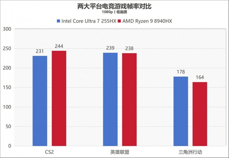 - 电竞游戏:《三角洲行动》178fps(领先9%)、《英雄联盟》239fps(与锐龙版238fps基本持平)、《CS2》231fps(落后5%)。