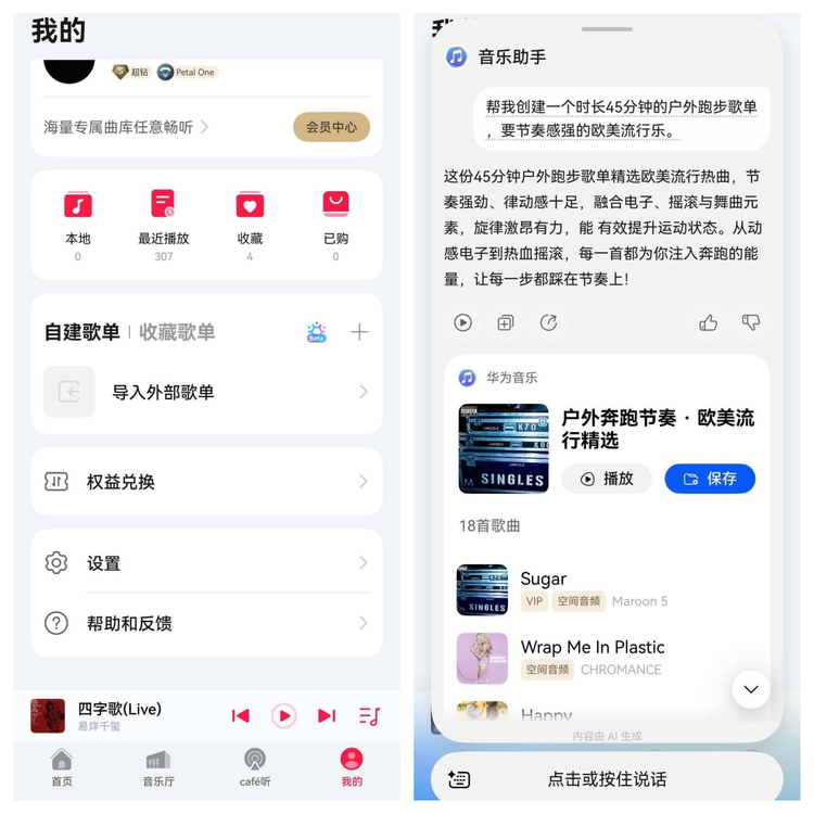 有了“音乐助手”,找歌变成了“说话”这么简单。只需在华为音乐-我的页面点击彩色按钮,对它说出你的需求,很快一张完全符合当下心境的AI歌单就生成了。听歌过程中的问题随口问了一下音乐助手,它也会立马给出了详尽的解析,从词曲作者到创作意图,讲得头头是道。