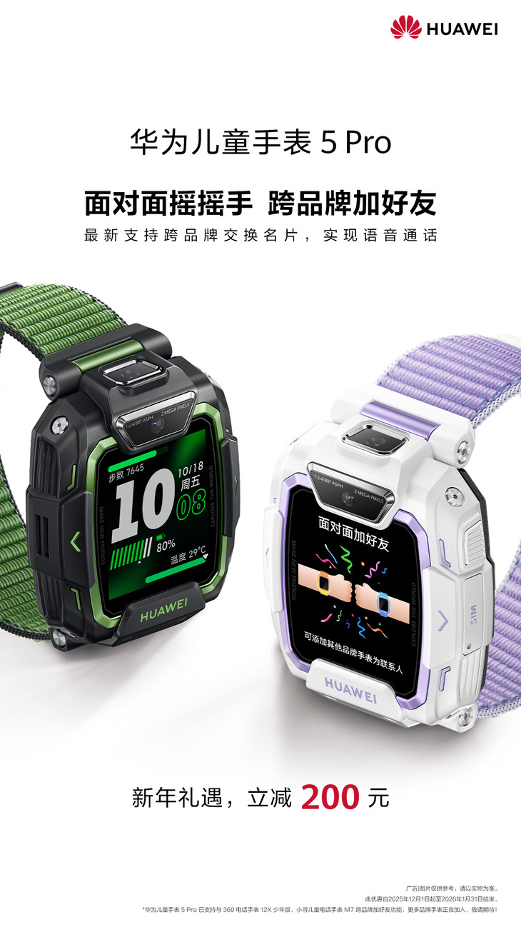 即日起,一直到 2026年1月31日,华为儿童手表5 Pro全渠道:包括电商平台、线下门店优惠立减200元,马上就元旦了,不知道给孩子送什么跨年礼物的朋友,不妨抓紧去看看