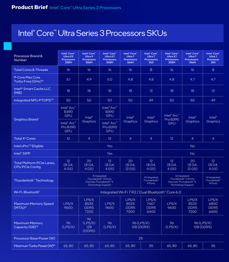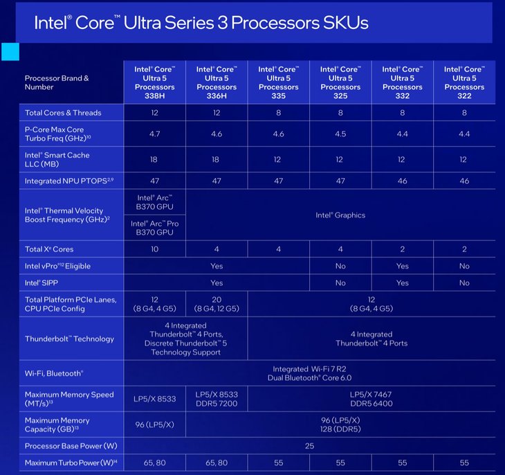 除了旗舰型号,酷睿Ultra 5 338H将配备拥有10组Xe核心的锐炫B370核显,而其他大多数型号则使用4组Xe核心的核显。值得注意的是,有两款尾数为“2”的处理器型号,其核显仅有2组Xe核心,这显然是为追求极致能效的轻薄设备准备的。