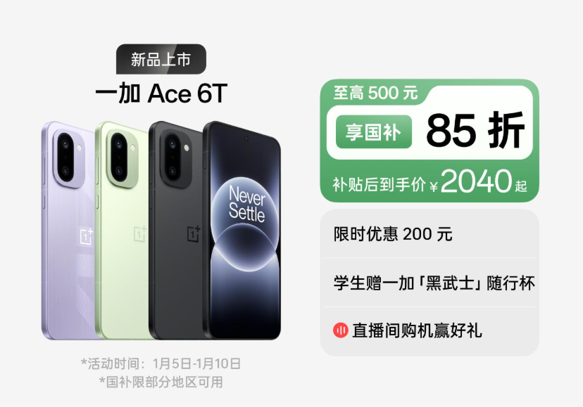 简约时尚的外观、超强的游戏能力以及综合全面的使用体验,一加Ace 6T展示出的了极高的性价比,目前叠加国补后起售价格仅2040元,2000元的价格你就可以入手一台旗舰手机,是年轻用户的超值之选。