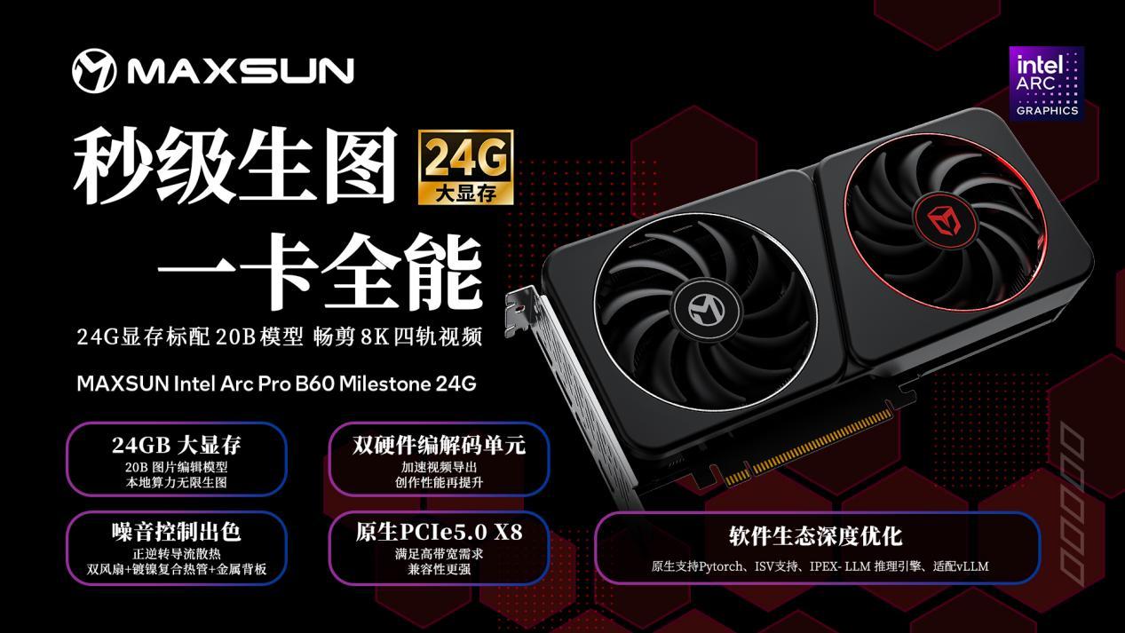 此前,英特尔已经针对专业市场带来了全新的锐炫Arc Pro B60专业显卡,配备了更大的显存。目前,英特尔AIC合作伙伴蓝戟(GUNNIR)与铭瑄(MAXSUN)正式宣布旗下锐炫Arc Pro B60专业显卡面向个人用户开售。该系列显卡此前仅面向OEM及系统集成商供应,此次开放零售补全了英特尔专业显卡的消费级市场布局,起售价低至5199元。