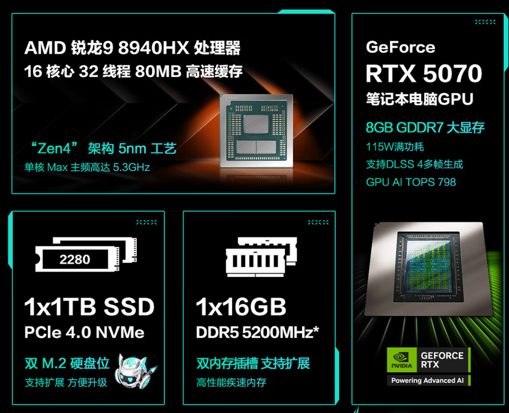 华硕天选6 Pro 锐龙版搭载了AMD锐龙9 8940HX移动处理器,采用“Zen 4”架构,拥有16大核32线程的强悍配置,加速频率高达5.3GHz,多核性能满满,还有80MB的超大缓存,其强大的性能配置在多任务处理上得心应手。无论是进行专业的内容创作还是玩高帧率网游、高画质3A游戏大作,这款处理器都能提供流畅且高效的体验。