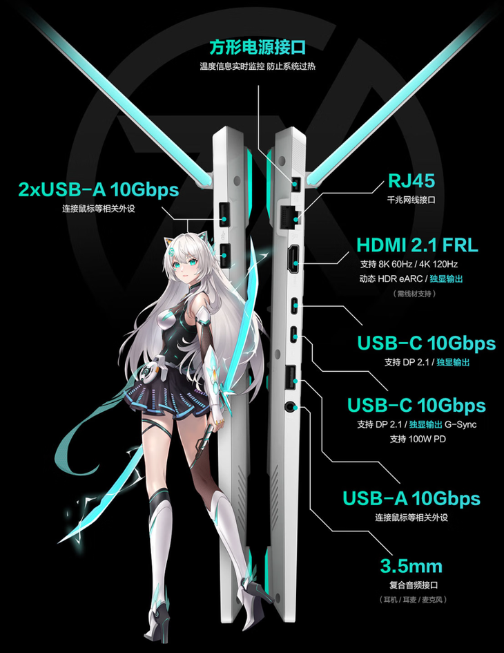 华硕天选6 Pro锐龙版拥有3个USB-A 10Gbps、2个USB-C 10Gbps接口,且双C口均支持DP 2.1协议,可外接超高刷电竞显示器。HDMI 2.1 FRL接口满血输出,支持至高8K@60Hz输出。另有RJ45网口,支持Wi-Fi 6E,游戏电竞畅联不掉线。此外电源接口也全新升级为方形接口,支持温度信息实时监测,防止系统过热。