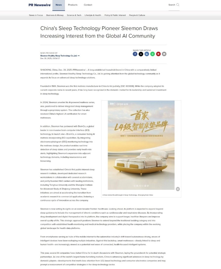 事实上,喜临门在睡眠科技领域的深耕已持续多年,目前拥有有效专利2472项,并成功发布全球首款消费级脑机接口AI床垫“宝褓·BrainCo”。去年底就有消息称,其研发成果吸引美国多家AI公司关注,未来有进一步战略合作的可能。美通社等多家海外权威媒体也对喜临门的科技进展进行了报道。