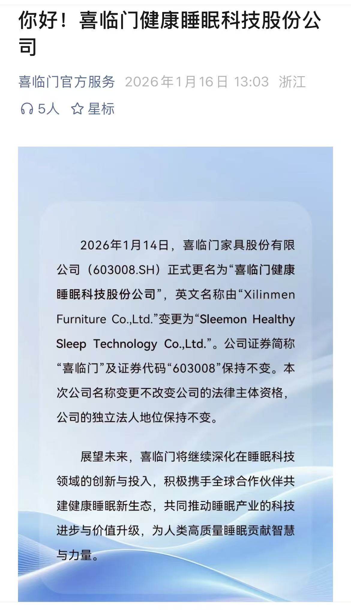 2026年1月14日,喜临门家具股份有限公司(603008.SH)正式完成品牌升级,公司全称变更为“喜临门健康睡眠科技股份公司”,英文名称同步更新为“Sleemon Healthy Sleep Technology Co.,Ltd.”。公司证券简称“喜临门”及证券代码“603008”保持不变,法律主体资格与独立法人地位亦保持不变。