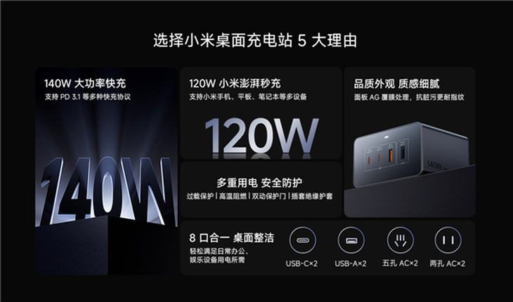 这款充电站采用8口合一设计,共有2个USB-C接口、2个五孔AC插口、2个USB-A接口以及2个两孔AC插口,总承载功率高达2500W。USB-C接口支持盲插,单口使用时可实现最高140W的输出,能够快速为手机、笔记本电脑等设备充电。此外,USB-C和USB-A接口还支持小米设备的最高120W快充,并向下兼容多种快充档位,包括100W、90W、67W和33W。