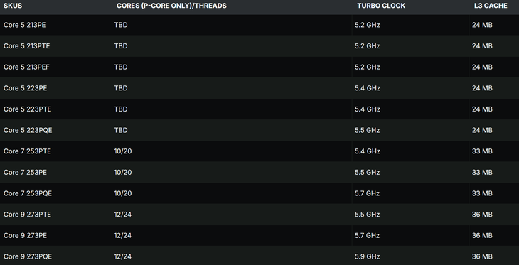从具体规格来看,三个级别处理器在缓存与睿频上呈现清晰梯度:酷睿5系列配备24MB L3缓存,预计搭载6-8个性能核,旗下213PE、213PTE、213PEF三款型号最大睿频均为5.2GHz,223PE、223PTE睿频提升至5.4GHz,顶配型号223PQE则达到5.5GHz;酷睿7系列统一搭载10个性能核与20线程,配备33MB L3缓存,253PTE、253PE、253PQE三款型号的最大睿频分别为5.4GHz、5.5GHz、5.7GHz;旗舰级酷睿9系列则升级为12个性能核与24线程,拥有36MB L3缓存,273PTE、273PE、273PQE的最大睿频依次为5.5GHz、5.7GHz、5.9GHz,其中顶配型号273PQE的睿频较 Raptor Lake Refresh系列旗舰酷睿i9-14900KS高出200MHz,性能表现极具冲击力。
