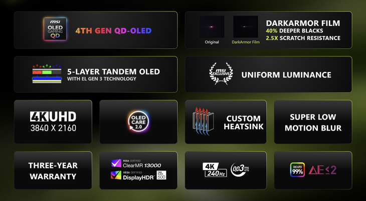 微星近日在官网上公布了新款的MAG 321UP X24游戏显示器,该款显示器采用了三星第四代QD-OLED面板,采用了5层Tandem OLED架构,搭载EL Gen 3技术,将亮度提升了30%。同时还支持DarkArmor护甲膜技术,可消除一般QD-OLED在环境光下常见的紫色或偏红色干扰,将纯黑深度提升最多达40%。另外屏幕硬度从H2提升至H3,能更有效地承受日常磨损。