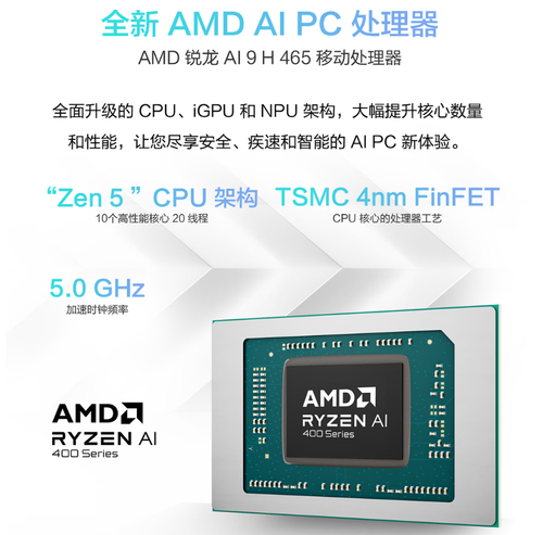 具体配置方面,华硕天选Air 2026配备了14英寸 16:10 2.5K分辨率的高清屏幕,支持100% sRGB色域显示。内置AMD锐龙AI 9 H 465处理器,采用10核心20线程设计,最高主频可达5.0GHz,内置Radeon 880M核显与XDNA2 NPU,至高拥有50 TOPS NPU AI算力,可大幅提升本地AI任务处理效率。