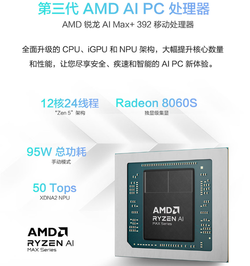 华硕天选Air 2026锐龙AI Max版采用的是AMD锐龙9 AI Max+ 392处理器,拥有12核心24线程,Max频率达到了5GHz,同时集成Radeon 8060s显卡,拥有40CU超大核心,具备出色的图形性能以及本地AI能力,也能够满足用户的游戏娱乐需求。