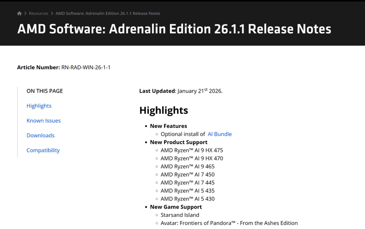 游戏支持方面,26.1.1版驱动新增对两款热门游戏的适配,分别是《阿凡达:潘多拉边境浴火重生版》与《星砂岛》。其中,《阿凡达:潘多拉边境浴火重生版》基于育碧雪花莲引擎打造,支持光线追踪全局光照等高级图形特性,此次驱动适配将确保AMD显卡用户获得更流畅、稳定的游戏画面,充分展现游戏中的潘多拉星球细节。