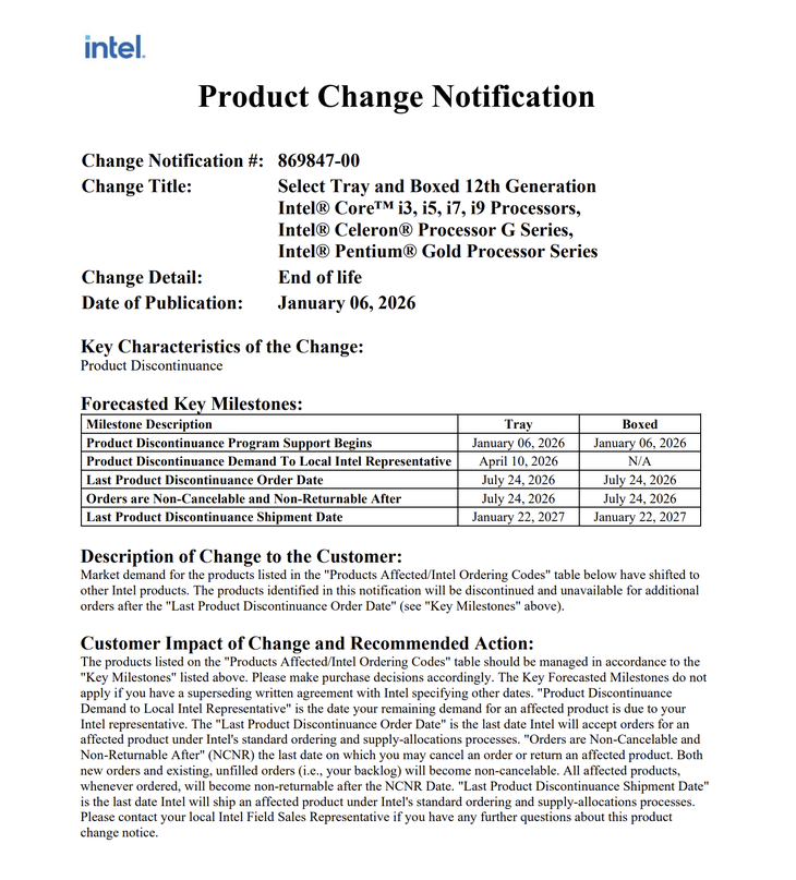 根据英特尔内部“产品变更通知”,Alder Lake-S的EOL阶段自2026年1月6日起正式启动,覆盖全系列盒装及托盘版本的桌面处理器,无任何型号例外。英特尔为市场预留了充足的过渡时间,明确要求合作伙伴需在2026年7月25日之前下达最后一批订单,而英特尔的最后发货日期则定在2027年1月22日,这意味着市场仍有超过一年的时间囤积备件、完成库存消化。值得注意的是,EOL之后,Alder Lake-S的技术支持将从英特尔架构正式过渡到英特尔嵌入式架构,针对非用户过错导致的故障处理器,其更换订单截止日期为2026年7月24日,此后将不再提供该系列产品的保修服务。