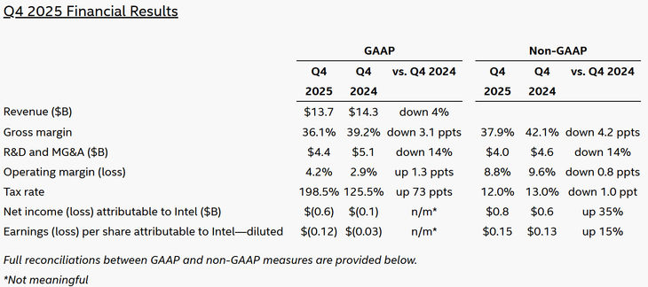 英特尔公布了2025年第四季度及全年财务业绩。公司CEO帕特·基辛格与CFO大卫·津斯纳强调了在人工智能时代CPU及x86架构的核心重要性,并宣布基于其最先进制程Intel 18A的首批产品已成功推出。尽管面临市场挑战,英特尔第四季度业绩超出预期,并在2025年全年实现了非GAAP准则下的显著扭亏为盈。在2025年第四季度,英特尔营收达到137亿美元,虽然同比下降4.1%,但较公司去年10月的预期高出4亿美元。非GAAP毛利率为37.9%,每股收益为0.15美元,同比增长15%,均超过此前展望。