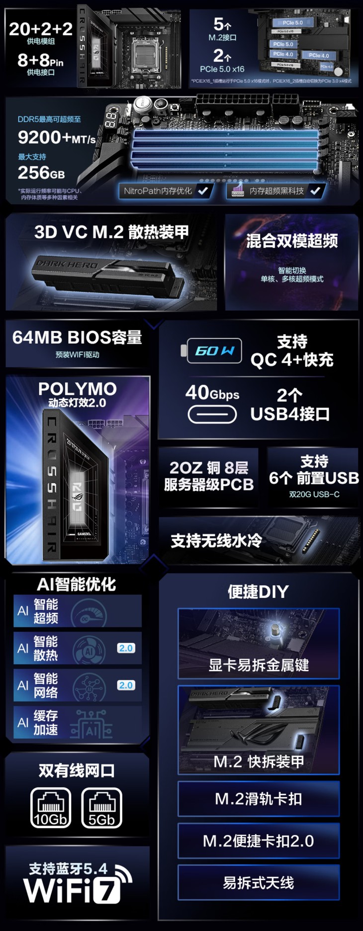 此次升级的一大重点是BIOS容量翻倍至64MB,为更复杂的智能功能与未来处理器优化提供了充足空间。其核心供电采用豪华的20+2+2相设计,每相均配备110A的SPS智能功率芯片,结合双8-PIN CPU供电接口,为AM5插槽的锐龙7000/8000/9000系列处理器提供了坚实可靠的动力基础。该主板集成了AI智能超频、混合双模超频与AI缓存加速引擎等一系列智能技术。其内存插槽经过特别优化,官方数据显示,搭配锐龙9000、8000及7000系列处理器时,最高可分别支持至8600MT/s、9600MT/s及8000MT/s的DDR5内存频率,充分释放高性能内存的潜力。