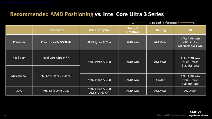 AMD和英特尔此前都已经在CES 2026上带来了全新的移动处理器产品系列,AMD带来了锐龙AI 400系列,英特尔则发布了全新的酷睿Ultra 300系列产品。虽然相关产品目前都尚未正式开售,但是竞争的暗流涌动已经开始看。AMD现已发布了一份针对英特尔即将推出的Panther Lake“Core Ultra Series 3”处理器的对比内容,宣称其Ryzen AI系列笔记本芯片将在从高端到入门级的各个细分市场占据优势。