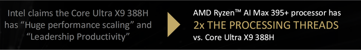 除了市场定位,AMD的简报更以罕见直白的方式逐条反驳了英特尔对旗舰型号Core Ultra X9 388H的宣传。针对英特尔声称其12 Xe3核显“独步天下”,AMD表示其Ryzen AI MAX 395+的图形性能比英特尔展示的数据快37%。对于英特尔宣传的“巨大的性能缩放和生产力领先”,AMD则强调其Ryzen AI MAX 395+拥有32个线程,是英特尔Panther Lake最高16线程配置的两倍。在能效方面,AMD质疑英特尔“领先的x86能效”说法,认为英特尔自己的幻灯片数据显示,其Panther Lake与自家前代Lunar Lake相比,在能效和电池寿命上提升有限。AMD特别指出,除了少数旗舰SKU,英特尔并未对其产品中其余部分的性能、功耗或AI能力做出具体承诺,这暗示其中端及入门产品可能面临挑战。
