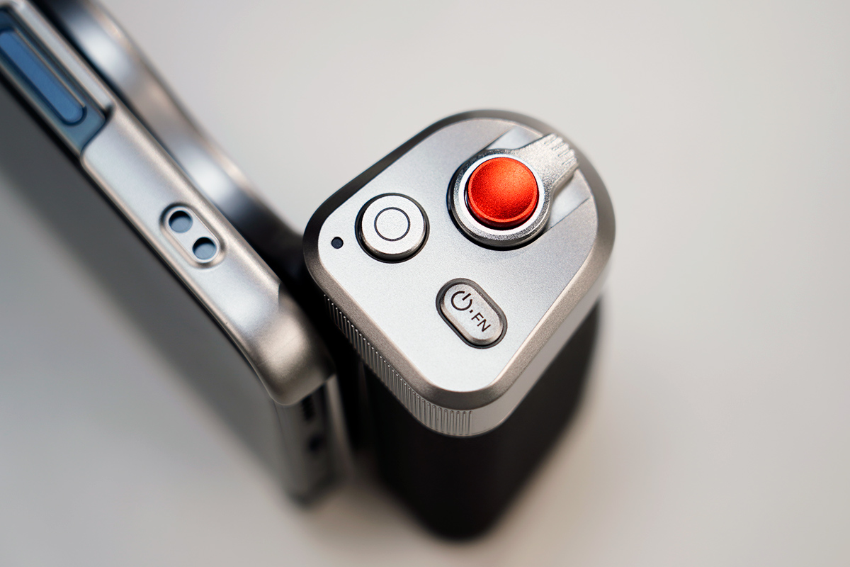 摄影手柄也支持非常丰富的功能,开机键在不安装增距镜头的情况下,还可以实现前后摄像头的切换。此外手柄还设置有录像键、拍摄键、变焦拨杆以及波轮键,使用起来与专业相机的体验相同。