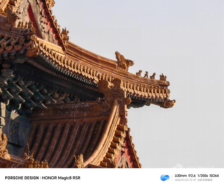800mm焦段下,我们已经可以看到房檐、屋脊以及脊兽的一些细节了。