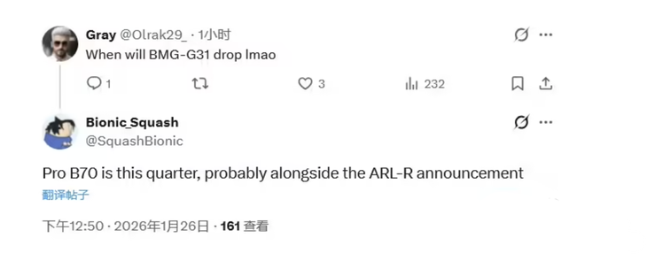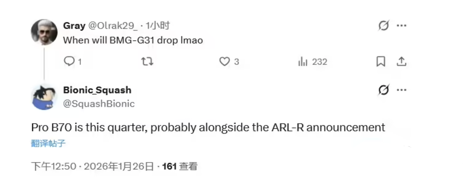 此前就有不少爆料表明,英特尔正在策划两款全新的Battlemage架构工作站显卡,将会采用更大的BMG-G31的“Big Battlemage”GPU核心打造,并全系配备高达32GB、256-bit位宽的GDDR6显存,旨在显著提升其在专业图形渲染与AI计算任务中的性能表现。而根据最新的消息来看,英特尔正计划于2026年一季度推出新一代锐炫Arc Pro工作站显卡,包括Arc Pro B70和B65两款型号。