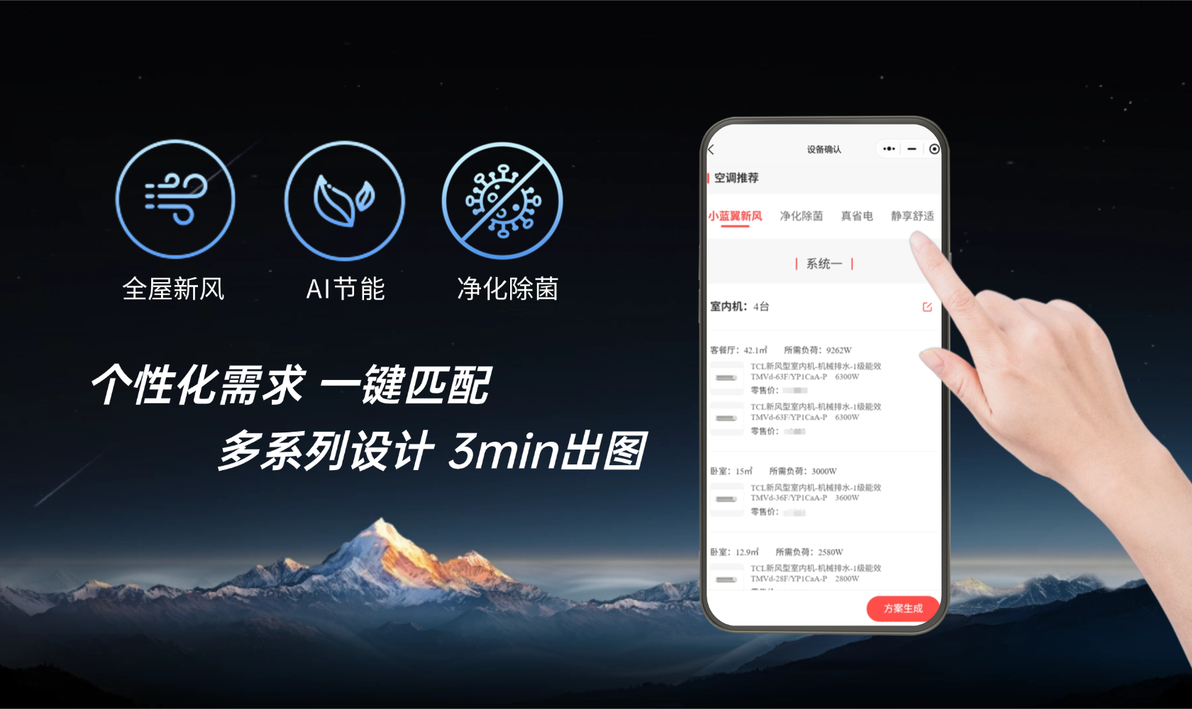 在这款工具中,TCL家庭中央空调用户只需输入小区名称,系统即可基于覆盖全国95%楼盘的2800万套户型数据库,通过AI算法在3分钟内生成包含新风、净化、省电等多系列的定制化解决方案,极大提升方案产出效率。
