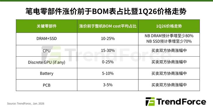 零部件集体涨价是本次出货量波动的核心诱因。报告指出,笔电的核心成本来自存储与处理器两大板块:本季度笔记本电脑所需的DRAM内存价格预计季增至少80%,SSD固态硬盘价格预计季增至少70%,二者在整机BOM成本中合计占比达10-25%;同时,英特尔正将更多晶圆产能向数据中心CPU倾斜,导致消费级笔电的老旧型号CPU供应短缺,价格同步上行。此外,PCB、电池等其他零部件也面临涨价压力——全球铜价上涨与电路板复杂度提升推高了PCB成本,大电池、Wi-Fi 7、USB4等高阶规格的普及则进一步加重了行业成本负担。