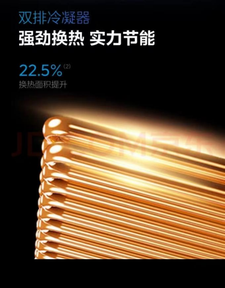 柜机产品采用双排冷凝器设计,明确标注为铜管换热系统,铜管换热面积提升 22.5%;