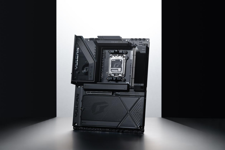 主板延续iGame Vulcan系列标志性的赛博风格,以深黑为主色,通过多层金属工艺打造出质感十足的散热装甲。鳍片式散热设计与一体式背板保障稳定运行,VRM区域的合金「智械视窗」与可自定义「智屏」,则为硬件增添了一抹未来科技感。