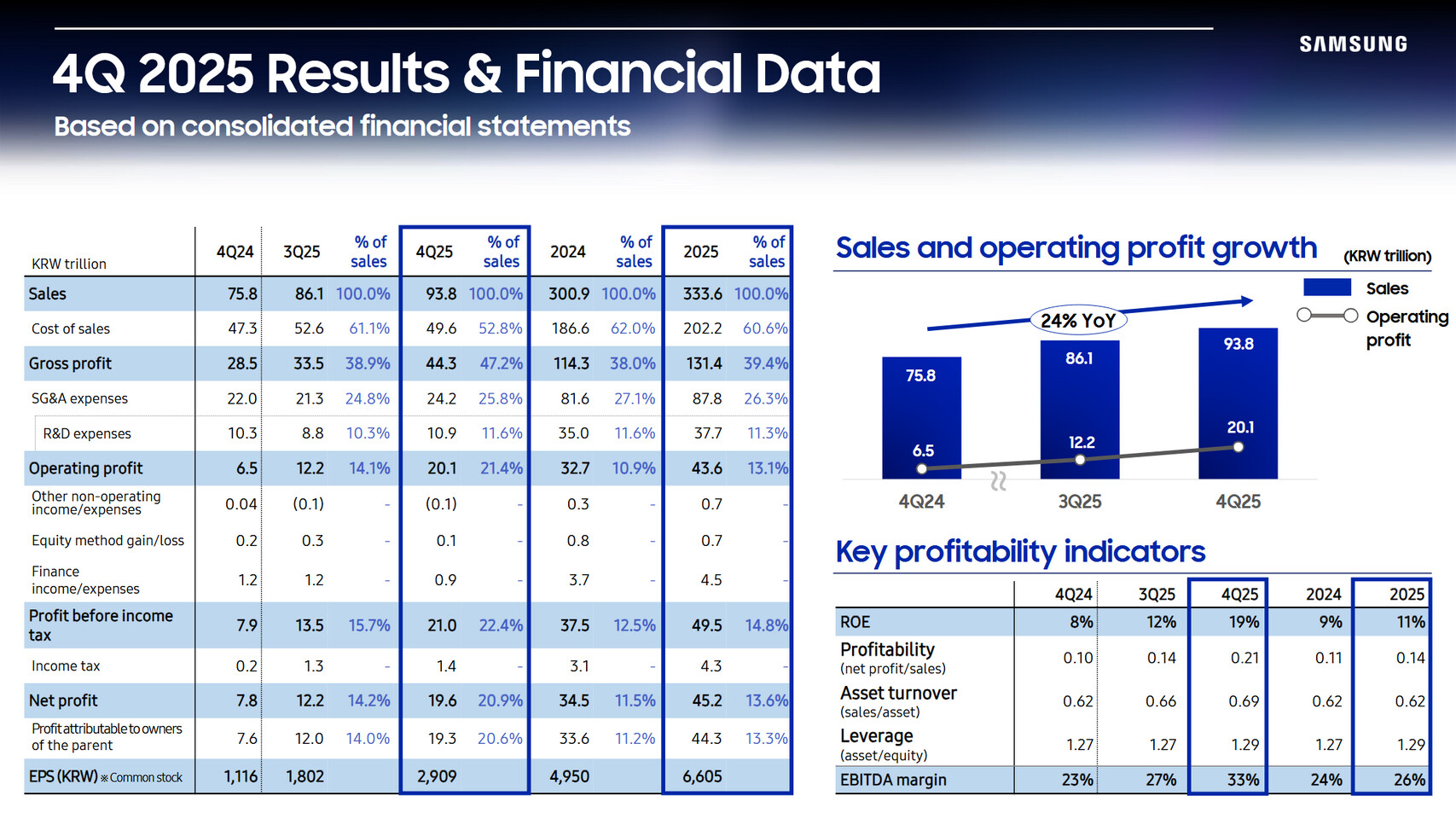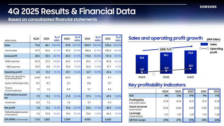 财报显示,2025年第四季度,三星实现合并营收93.8万亿韩元(约合人民币3774.84亿元),环比增长9%、同比增长24%;营业利润达20.1万亿韩元(约合人民币323.7亿元),同比飙升209%、环比大幅增长,双双刷新韩国企业单季最高纪录。全年来看,公司营收333.6万亿韩元(约合人民币14984.82亿元),同比增长11%;营业利润43.6万亿韩元(约合人民币1628.46亿元),同比增长33%,整体呈现强劲增长态势。