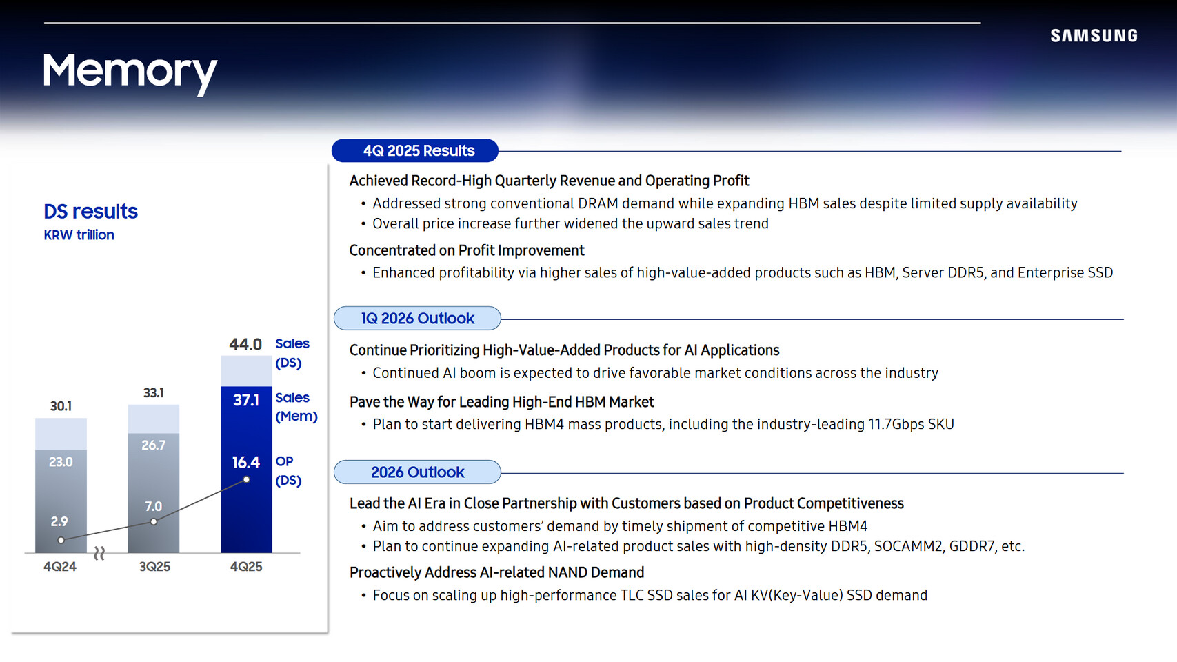 AI浪潮的持续发酵成为关键推手。目前全球AI内存供应短缺,服务器DRAM需求激增,三星顺势扩大AI相关存储产品布局,已向英伟达、谷歌等核心客户供应HBM3E,并完成HBM4开发,计划于2026年一季度开始交付,其11.7Gbps的性能达到行业领先水平,旨在巩固高端HBM市场领导地位。展望2026年,三星将持续依托AI优势扩大增长动能。存储业务计划通过及时交付HBM4,扩大DDR5、GDDR7等AI相关产品销量;代工业务目标实现两位数收入增长,加快第二代2nm产品量产,优化4nm工艺,通过技术整合增强竞争力。公司表示,将持续聚焦高性能AI相关产品,把握AI和服务器需求增长机遇,巩固全球AI与半导体领域的领先地位。