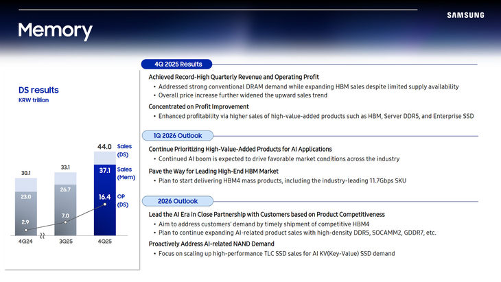 增长的核心动力来自AI驱动的内存业务及半导体部门的突出表现。财报指出,器件解决方案(DS)部门季度销售额环比增长33%,其中存储业务凭借高带宽内存(HBM)等高端产品销量扩大及市场价格上涨,创下季度营收和营业利润历史新高,同时帮助三星重夺DRAM市场榜首位置。该业务重点聚焦HBM、服务器DDR5等高附加值产品,有效提升盈利能力,仅DS部门就贡献了集团80%的营业利润。