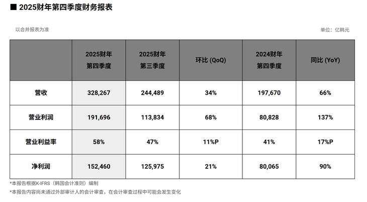 2025财年第四季度,公司营收32.8267万亿韩元,环比增长34%;营业利润19.1696万亿韩元,环比增长68%;净利润15.246万亿韩元,环比增长21%。三项指标均创季度历史新高,其中营业利润率58%、环比提升11个百分点。业绩增长的核心动力来自AI存储器需求爆发:HBM销售额同比增长逾一倍,成为拉动营收的关键;同时,面向服务器的通用DRAM和NAND闪存需求也显著增加。