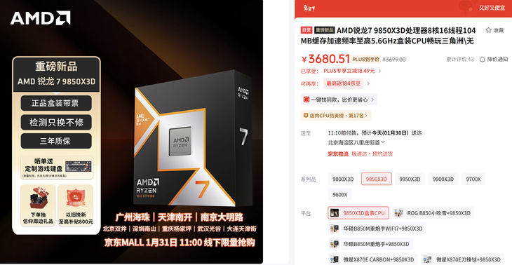 没有内存贵!AMD锐龙7 9850X3D上市,国行售价3699元