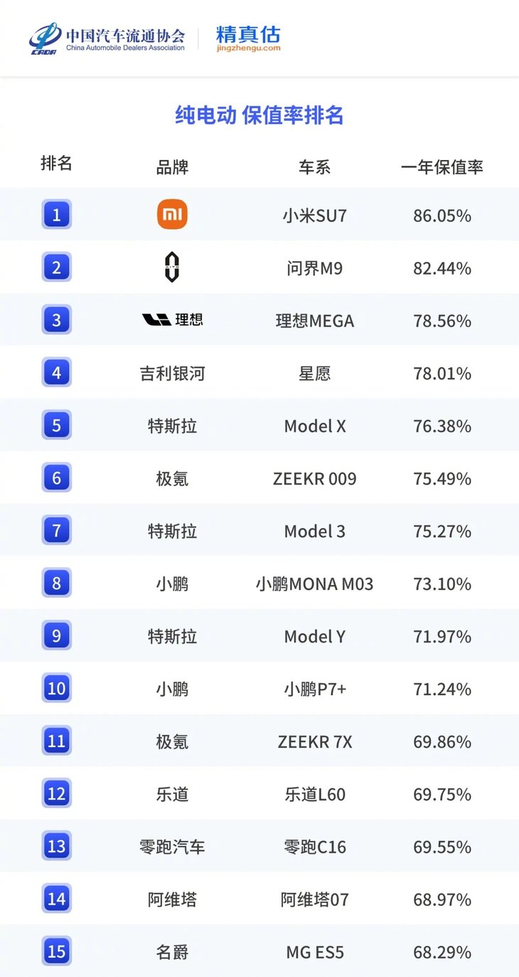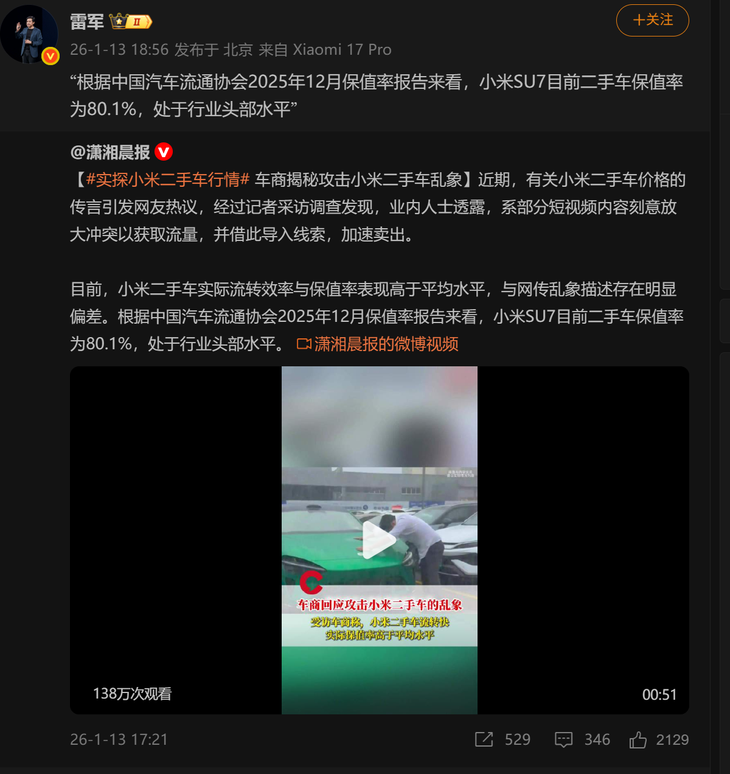 为了让网友更直观地了解情况,雷军展示了中国汽车流通协会与精真估联合发布的“2025年度中国汽车保值报告”。该报告数据显示,小米SU7的2025年度纯电车型在保值率方面表现优异,达到86.05%,不仅排名第 一,还成为保值率最强的电动汽车。雷军对这些二手车商的言论表示不解,并呼吁网友在遇到类似情况时积极举报。