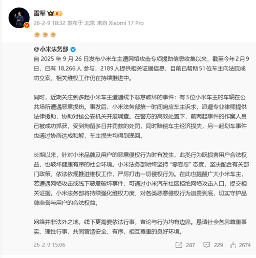 根据小米官方最新披露,自 2025 年 9 月 26 日正式开通小米车主遭网络攻击专项援助通道以来,维权工作持续推进。截至今年 2 月 9 日,已有 18266 人参与信息登记,2189 人提交了相关证据材料。在小米法务团队的专业支持下,目前已成功协助 51 位车主向法院完成立案,相关维权案件还在进一步处理中。