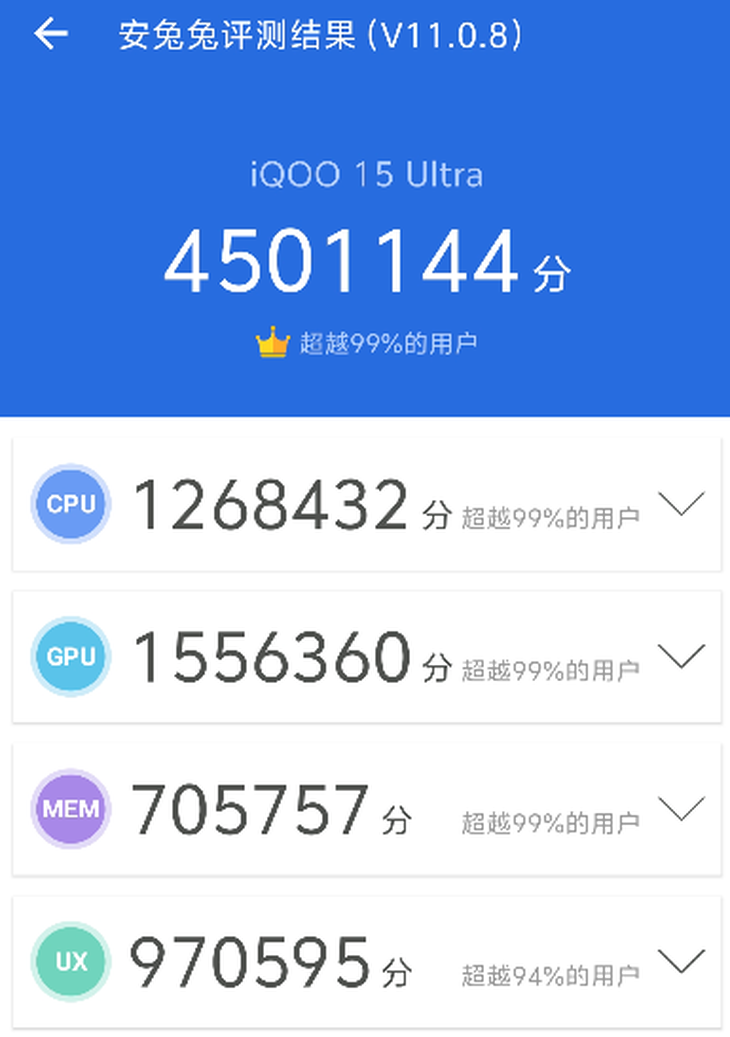 先来说说游戏党最关心的性能表现,iQOO 15 Ultra的实力,足以称得上“性能怪兽”。核心搭载第五代骁龙8至尊版处理器,搭配自研电竞芯片Q3,全系标配LPDDR5X Ultra Pro内存,传输速率高达10667Mbps,安兔兔跑分直接冲到450万,接近下一代旗舰水准,硬件底子拉满。更关键的是,强悍性能背后,还有一套“夯爆”的散热系统保驾护航,彻底解决高负载游戏发烫、掉帧的痛点。